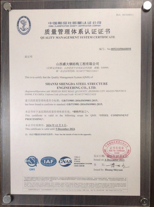 山西盛大鋼結(jié)構(gòu)工程有限公司,成立于1996年5月,是中國鋼結(jié)構(gòu)協(xié)會會員單位,山西鋼結(jié)構(gòu)協(xié)會副會長單位。成立二十多年來,公司始終秉持“質(zhì)量為本,科技創(chuàng)新,誠信創(chuàng)業(yè),共謀雙贏”的經(jīng)營理念,堅(jiān)持走“創(chuàng)新、協(xié)調(diào)、綠色、發(fā)展、共享”的發(fā)展之路。未來,山西盛大鋼結(jié)構(gòu)公司將繼續(xù)在董事長賈怡明的帶領(lǐng)下,嚴(yán)把生產(chǎn)質(zhì)量和鋼結(jié)構(gòu)工程質(zhì)量關(guān),不斷向致力于打造“年產(chǎn)十萬噸山西鋼結(jié)構(gòu)加工基地”的目標(biāo)邁進(jìn)。