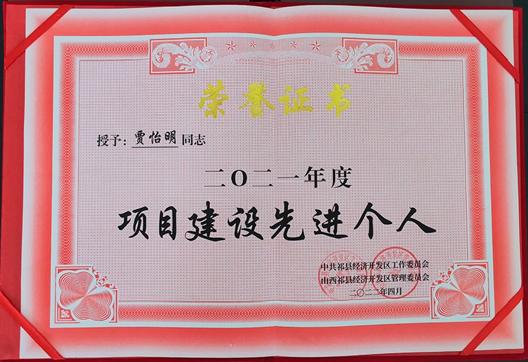 公司董事長賈怡明同志,在2021年開發(fā)區(qū)項目建設(shè)先進(jìn)表彰大會上,被中共祁縣經(jīng)濟(jì)開發(fā)區(qū)工作委員會和山西祁縣經(jīng)濟(jì)開發(fā)區(qū)管理委員會共同授予“二〇二一年度項目建設(shè)先進(jìn)個人”榮譽稱號。